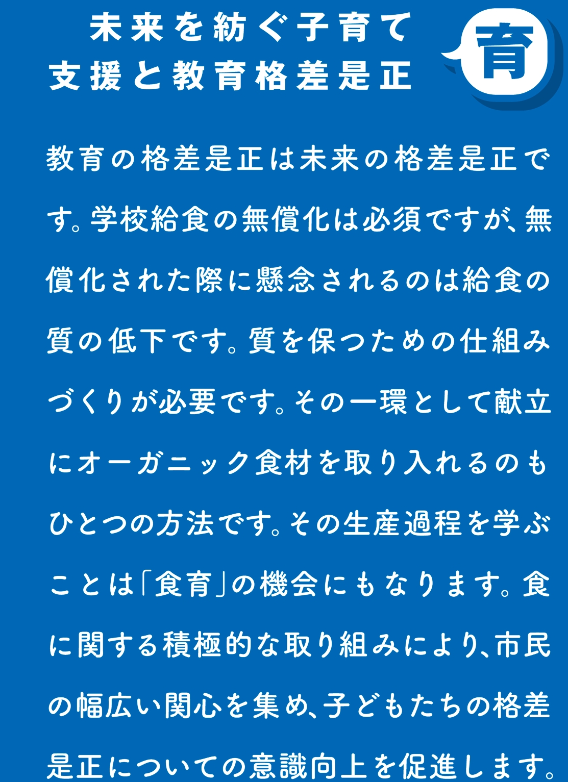 尼崎の明日について、まず私に話してみませんか? 会話からはじまる街づくり「5つの目標」 🔷声:市民の声を生かす行政と公共サービス 🔷育:未来を紡ぐ子育て支援と教育格差是正 🔷暮:安心して暮らしていくための福祉拡充 🔷働:労働者にとって安心で安全な労働環境 🔷生:多様な人たちと共に生きる社会の実現